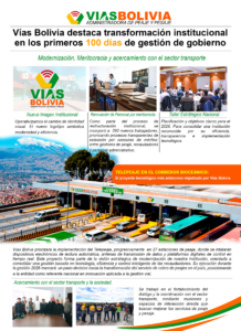 Entre los principales logros del nuevo Gobierno, en la visión de terminar con el “Estado tranca” y volver a poner a Bolivia en el mundo, Vías Bolivia destaca la implementación del Telepeaje en el corredor bioceánico, la renovación de imagen institucional, la reestructuración de personal basada en meritocracia, la realización de un taller estratégico nacional y el fortalecimiento del acercamiento con el sector transportista.